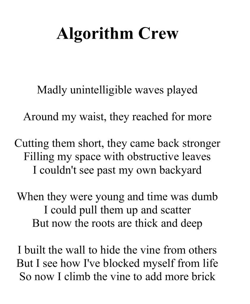Wildly incomprehensible currents danced, encircling my waist as they yearned for greater depths. Halting their advance only amplified their vigor when they surged back, inundating my surroundings with a tangle of obstructive foliage. My once-clear view extended no further than my own home, during an era of youth and naivety when the passage of time held little significance. I could effortlessly uproot and disperse them back then, yet now their resilient roots lie entrenched, thick and deep within the earth. I erected a barrier to shield the vine from prying eyes, inadvertently closing myself off from life’s experiences. Recognizing this oversight, I now scale the vine, adding more bricks to the wall.